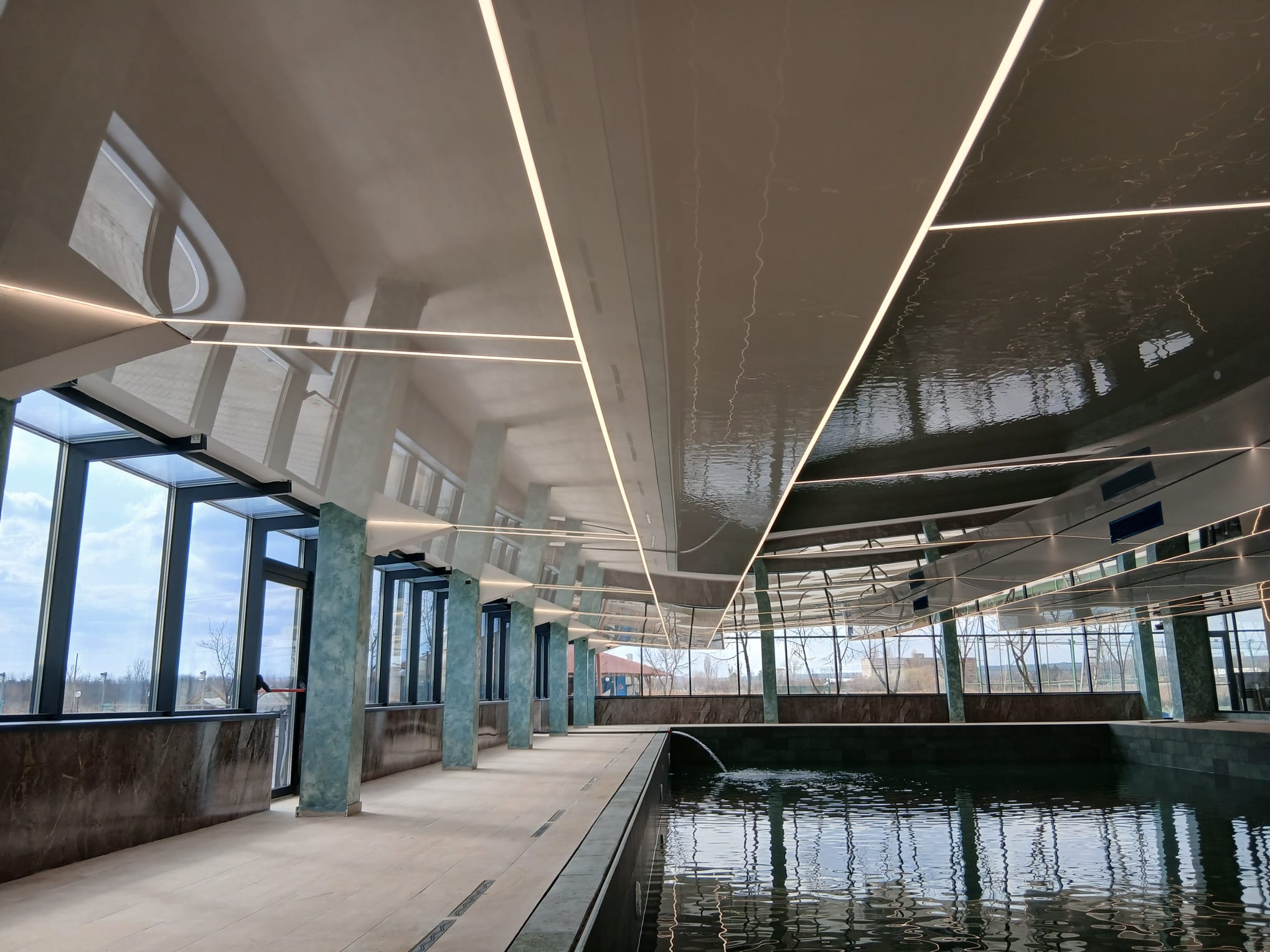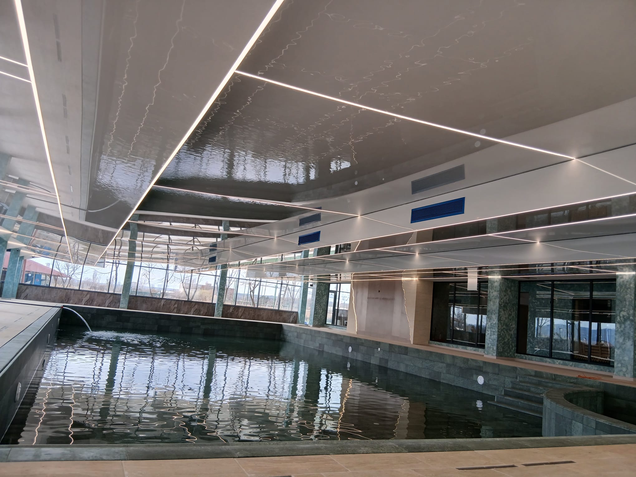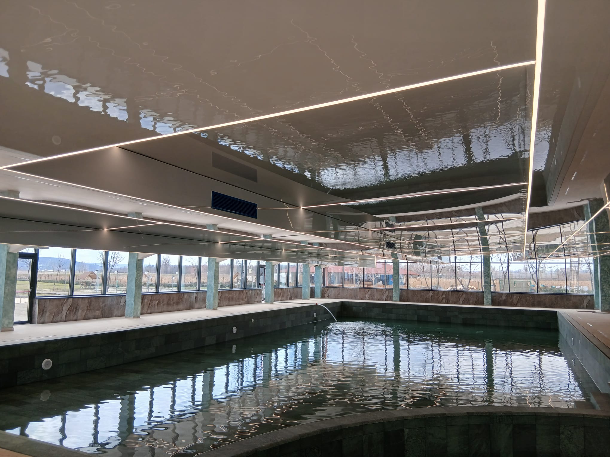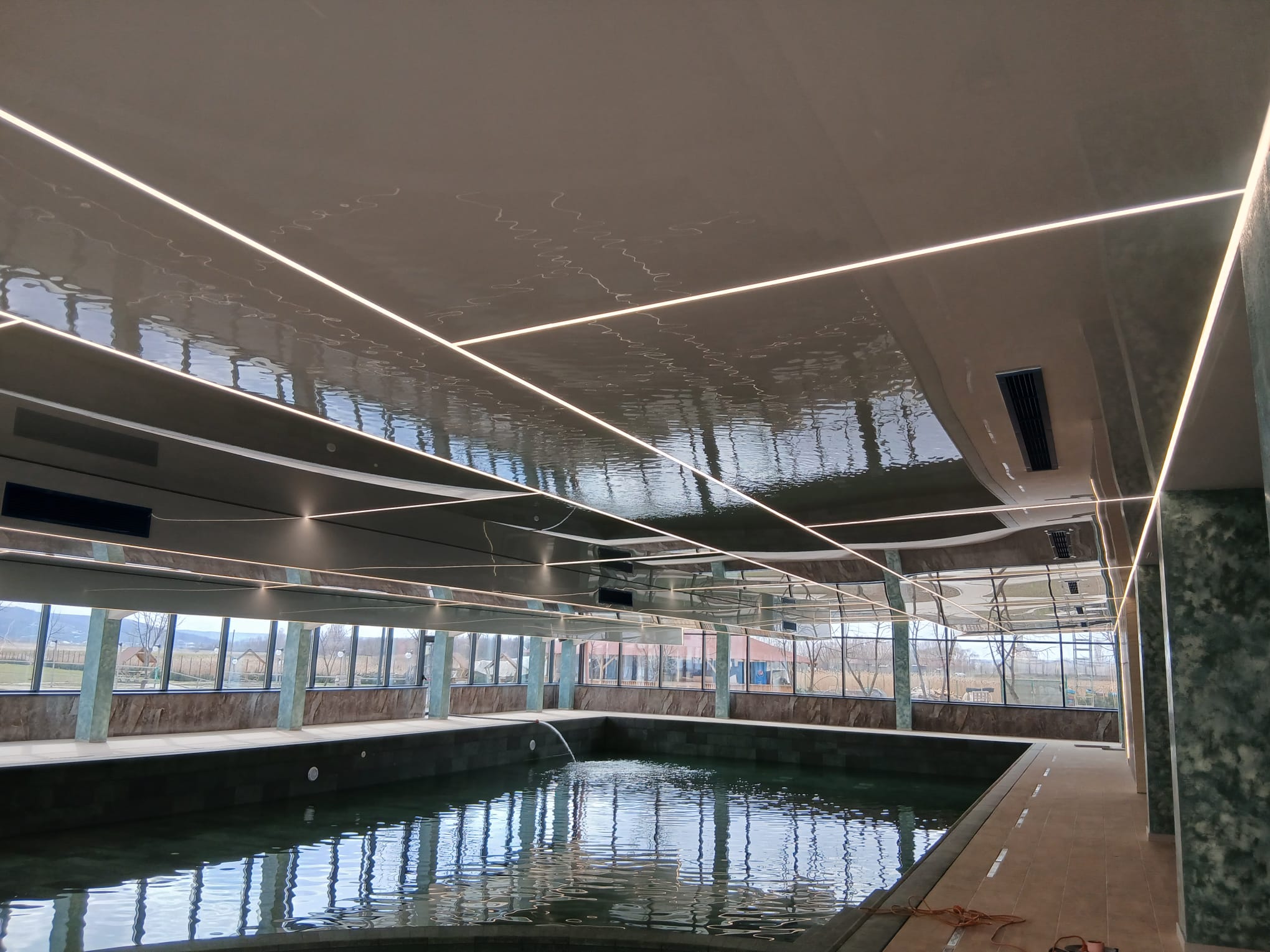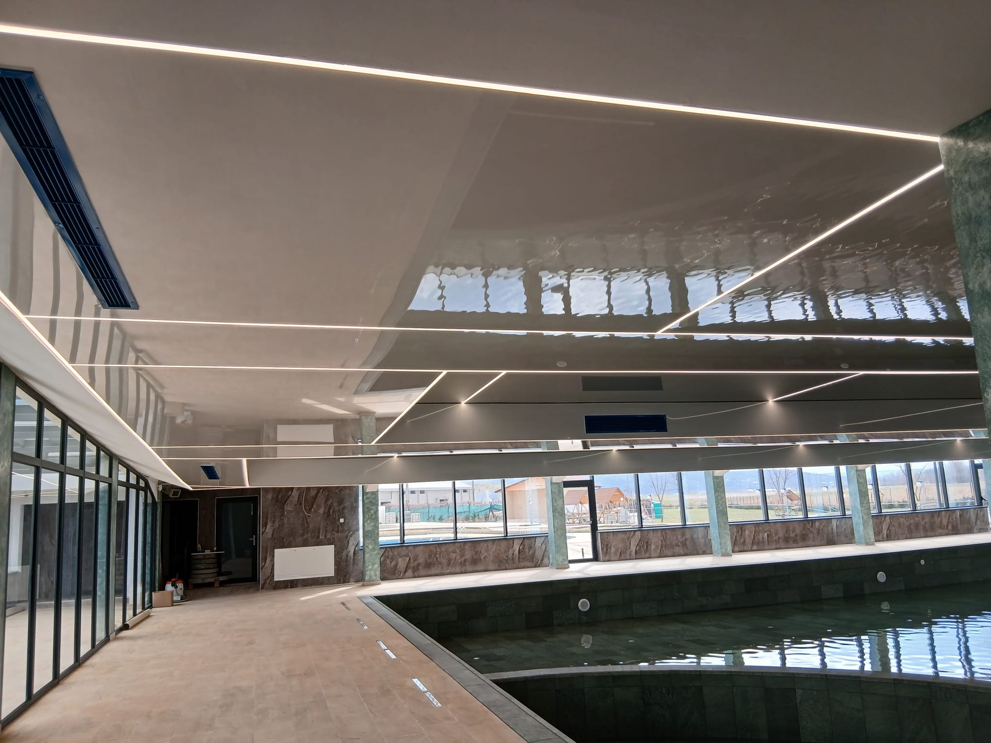 Pentru noul proiect Greenfield Club Bârlad, am realizat un tavan extensibil alb lucios, integrat cu profile moderne de iluminare LED alb. Designul creează un efect spectaculos de reflexie, amplificând spațiul și oferind un ambient elegant, perfect pentru zona de relaxare și piscină.